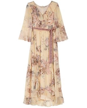 Sleeveless Maxi Dress With Floral Print And Belt - Metallic