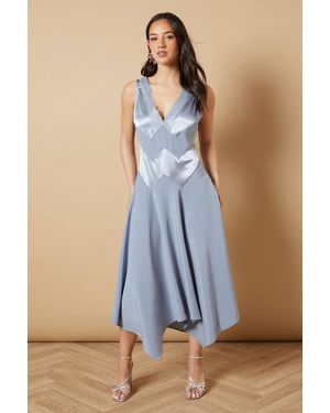 V Neck Mesh Asymmetric Midi Dress - Blue