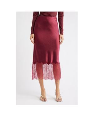 Lace Trim Satin Midi Skirt - Red