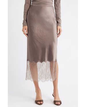 Lace Trim Satin Midi Skirt - Brown