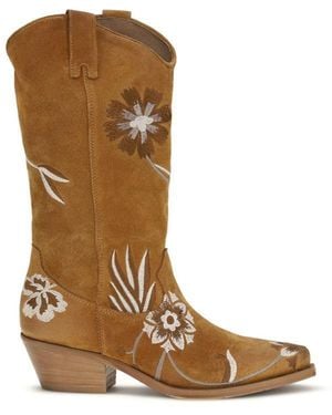Floral-Embroidered Boots - Brown