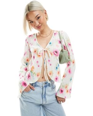 Plisse Long Sleeve Tie Front Top - White