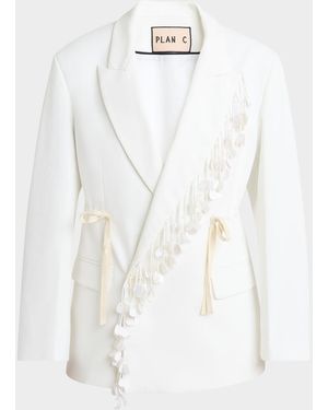 Sequin-Fringe Drawstring Double-Breasted Blazer Jacket - White