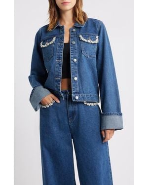 Rhinestone Detail Denim Trucker Jacket - Blue