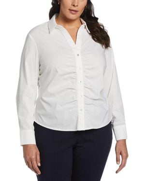 Plus Size Ruched Front Poplin Long Sleeve Button-down Shirt - White