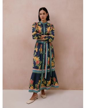 Amber Dress A High Neckline Three-Quarter Sleeves Intricate Border Detailing And A Matching Fabric Belt Cinching The Waist - Blue
