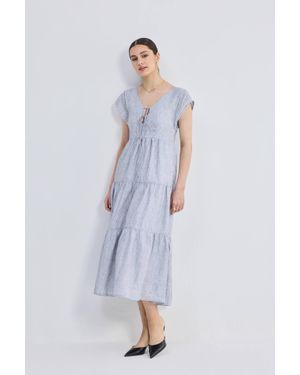 Oversized V Neck Short Dress With Frayed Sleeves - Blue