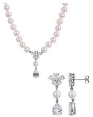 Macys Cultured Freshwater Pearl Created Sapphire Drop Earrings Necklace In Sterling Silver Collection - White