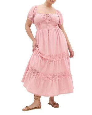 Haven Lace Trim Puff Sleeve Midi Dress - Pink