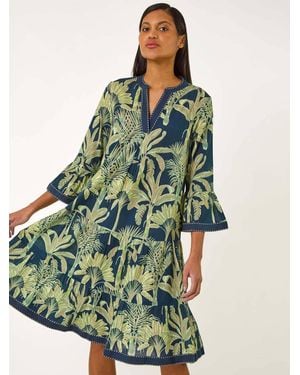 100% Cotton Tropical Lace Detail Tiered Dress - Blue