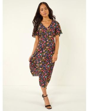 Petite Abstract Button Pocket Stretch Dress - Blue