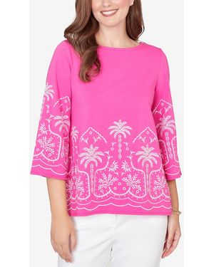 Petite Palm Tree Embroidered Knit Top - Pink