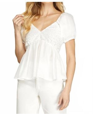 Short Puff Sleeve Woven Top With Lace V-Neck - White