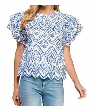 Embroidered Eyelet Ruffle Sleeves Top - Blue