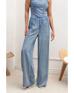 Washed Pleated High Waist Wide Leg Chambray Pants - Blue