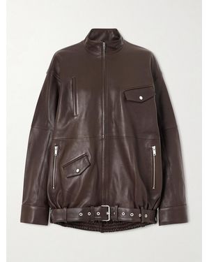 Belted Leather Bomber Jacket - Brown