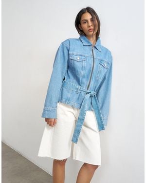 Denim Funnel Neck Elastic Hem Detail Jacket Ultra-Distressed - Blue