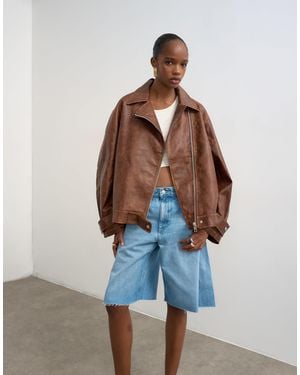 Faux Leather Funnel Neck Biker Jacket - Brown