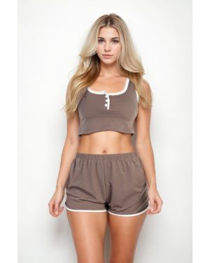 Casual French Terry Sleeveless Button Front Contrast Trim Cropped Tank Top And Shorts Set - Brown