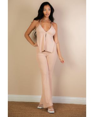 Fashnzfab Split Front Backless Halter Top & Flare Pants Set - Natural