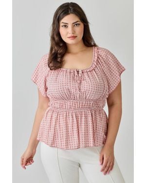 Off Shoulder Long Bubble Sleeve Plaid Top - Pink