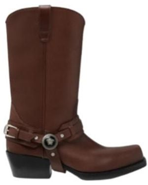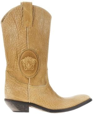Versace has been breaking fashion rules since its founding in 1978, boasting a rich heritage of luxurious design, glamorous Italian influence and boundary-breaking style. Adorned with the trademark 'Medusa head' logo, Versace's lavish creations are beautiful, playful and often audacious, making the brand a coveted name worldwide. Our range of Versace boots brings the daring for which Versace is known together with classic Italian cool. Lavish knee-highs and thigh-highs meet tough, boisterous combat boots; while details such as chains, mesh and medallions nod to Versace's edgy heritage.
