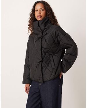 High Neck Quilted Jacket With Tie Details - Black