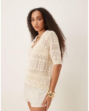Patterned Crochet Short Sleeve Knitted Polo Top - Natural