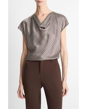 Pressed Plaid Silk Cowl-Neck Blouse - Gray