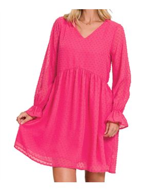 Swiss Dot Long Sleeve V-Neck Dress - Pink