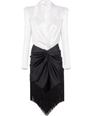 Draped And Fringed Satin Tailored Dress - White