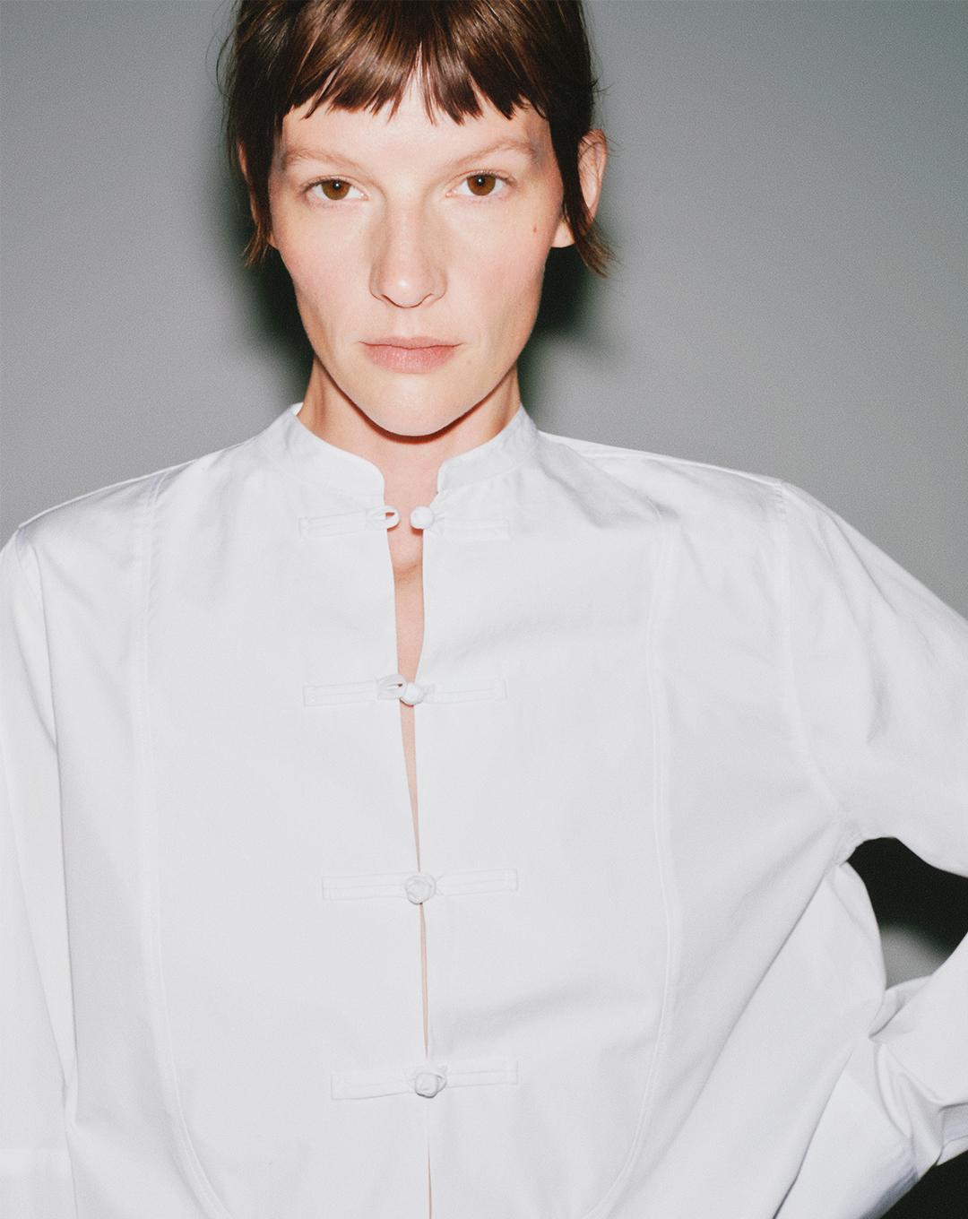 Crisp. Unapologetic. As severe as it is sensual. A good men’s tuxedo shirt, with a pleated front, French cuffs, and preferably a bit of starch left in the collar, does what no silk blouse ever could. It sharpens a pair of jeans, de-fussifies a midi skirt, and makes any open blazer look like a thought rather than an accident. Tuck it, belt it, undo one button too many. You’re in charge.